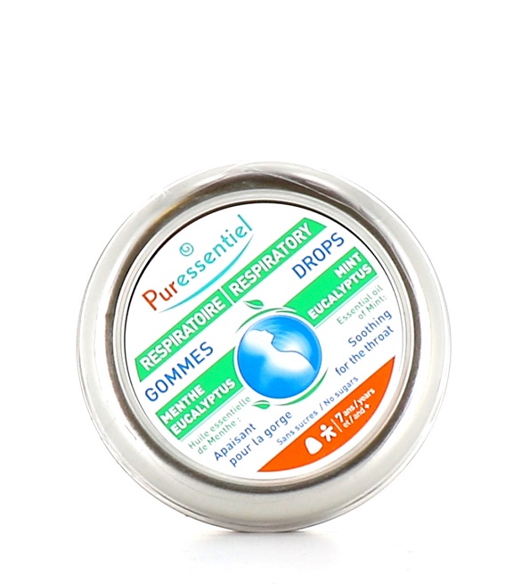 Les gommes menthe eucalyptus Respiratoire Puressentiel contiennent de l’huile essentielle de menthe à l’effet apaisant sur la gorge, le pharynx et les cordes vocales.
