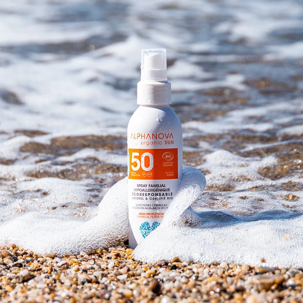Découvrez le nouveau spray solaire familial ALPHANOVA organic SUN®. Ce nouveau né au sein de la gamme se démarque de deux façons. Premièrement, avec un flacon beaucoup plus écologique en aluminium recyclé et recyclable, qui permet de réduire de 70% la quantité de plastique utilisé pour un flacon de cette dimension.