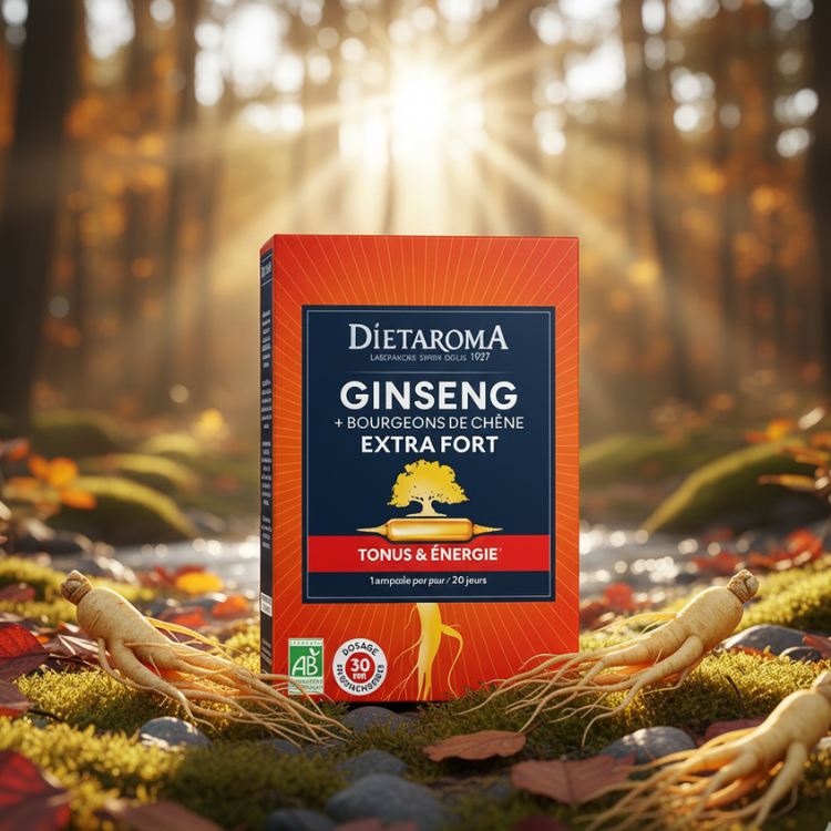 - Le chêne, symbole de force et de longévité, s’associe au ginseng sous forme d’extrait de bourgeons de feuilles frais d’origine France.