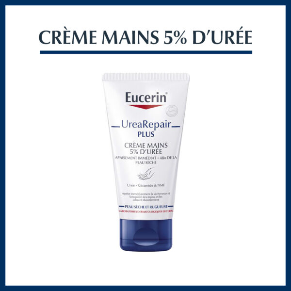 Highlights:EUCERIN Urea repair PLUS, 5% urée + céramides et NMF. Crème mains réparatrice. Atténue immédiatement la sécheresse et la rugosité des mains. Absorption rapide et non collant. Mains très sèches et rugueuses – 75ml.Prenez soin de vos mains au quotidien et préservez-les de la sécheresse en appliquant régulièrement Eucerin UreaRepair PLUS Crème Mains 5% d’Urée.Une crème mains réparatrice pour les peaux sèches à très sèchesLe froid, la chaleur, les changements de températures, la toxicité de l’air, agressent continuellement votre peau, notamment vos mains, plus exposées que les autres parties du corps.À force, votre protection naturelle cutanée est endommagée laissant apparaître des irritations de l’épiderme, des démangeaisons, des rougeurs ou des desquamations.Pour stopper cette sécheresse persistante et désagréable, il suffit d’adopter un geste essentiel : celui d’hydrater vos mains délicates chaque jour avec Eucerin UreaRepair PLUS Crème Mains 5% d’Urée.