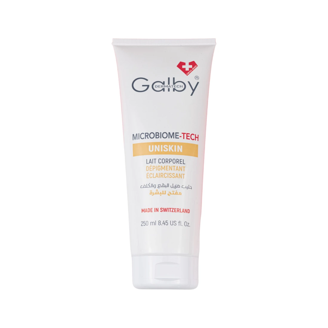 Lait Corporel Dépigmentant Eclaircissant UNISKIN de Galby Dermatech avec sa texture légère et soyeuse pour tout type de peau , combine la technologie du microbiome avec des actifs dépigmentant en assurant une hydratation profonde , pour une action complète. Il unifie le teint pour révéler une peau visiblement plus claire et lumineuse. Adoptez une routine de soin qui optimise votre éclat naturel tout en hydratant votre peau.