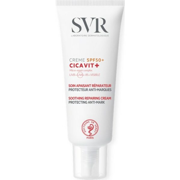 CICAVIT+ Crème SPF50+ est un soin apaisant intense qui accélère la réparation cutanée X7 et cible tous les types de rayons pour limiter les risques de marques rouges et brunes
