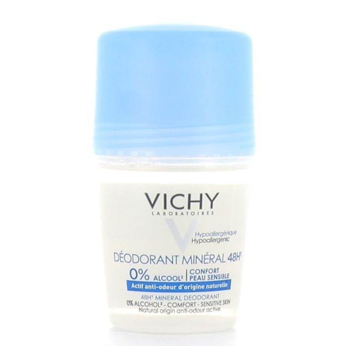 Vichy Déodorant Minéral 48H Roll-On 50 ml est un déodorant minéral sans sels d’aluminium, sans alcool, sans paraben qui convient à toutes les peaux, même fraîchement épilées. Sa formule hypoallergénique avec tolérance optimale associe du gluconate de zinc et 15 minéraux de l’eau minéralisante de Vichy pour une efficacité anti-odeur pendant 48 heures, mais aussi de la Provitamine B5 apaisante.
